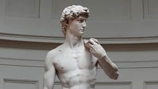 La escultura de mármol de Miguel Ángel representa al David bíblico, desnudo, con un cabestrillo al hombro y una piedra en la mano, listo para la batalla con Goliat.